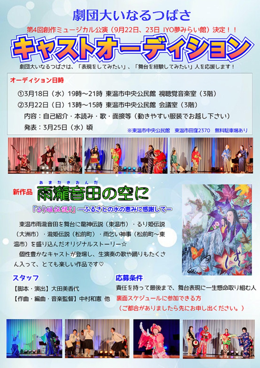 劇団大いなるつばさ第4回公演となる、2026年9月公演予定の創作ミュージカル「雨瀧音田の空に」!