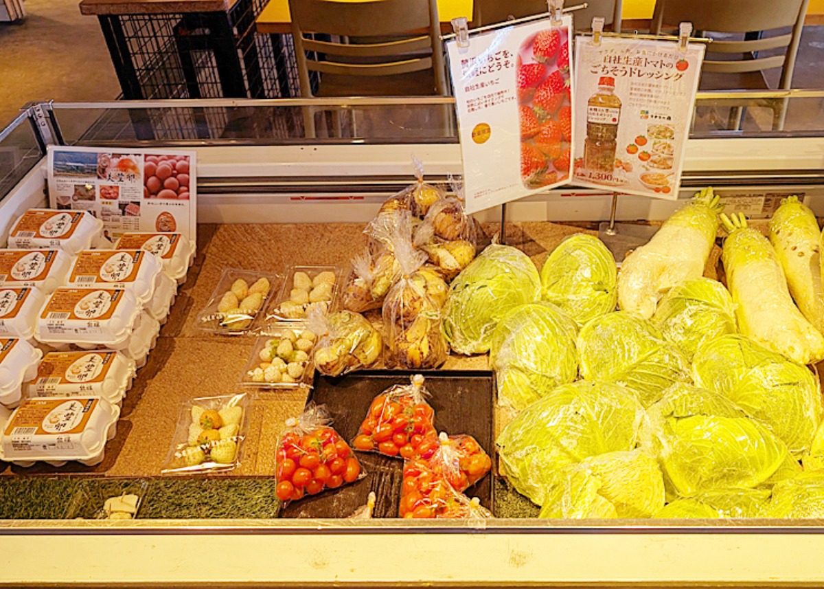こちらがお野菜コーナー。新鮮なキャベツや大根、さらに卵や、珍しい白いちごもありました。「LINE友だち」で、お野菜はなんと100円!