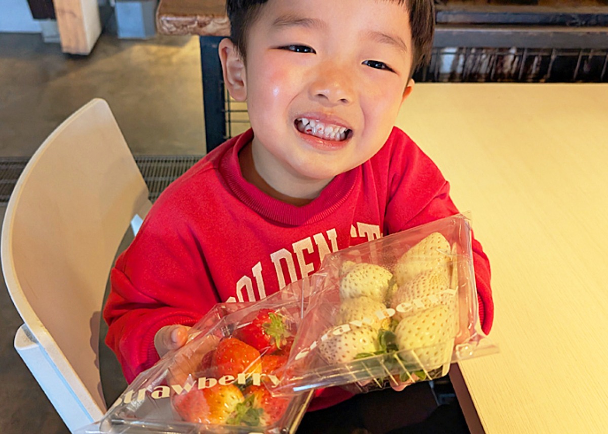 食後のデザートに購入した、いちごをパクリ♪ 「赤も白もおいし〜!」と、歯にいちごをつけたまま満足そうでした!笑