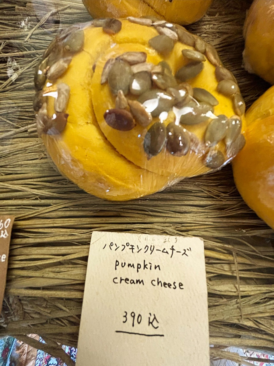 パンプキンクリームチーズ1個390円です。向日葵の種がたくさん乗って、インパクトのあるラクダピクニックの看板商品ですね。