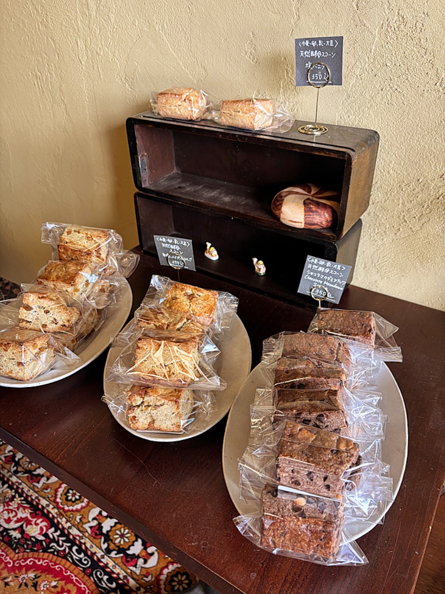 焼き菓子コーナーの一部にあるスコーンです。大きめのスコーンで、外側の香ばしさと内側のしっとり・ホロホロとした食感が特徴です。ベーグル同様、季節に合わせた素材が使われています。