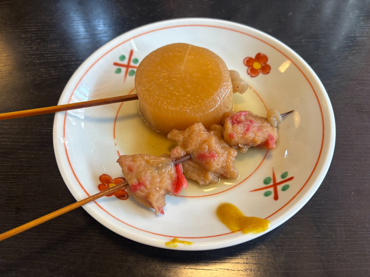 しっかり出汁が染み込んだ大根と珍しくて惹かれた赤天(練り物串)、どちらも1本150円です。とろとろの大根、紅しょうががアクセントになった練り物、どちらもとても美味しくてお蕎麦を食べる前から幸せな気持ちになりました♪