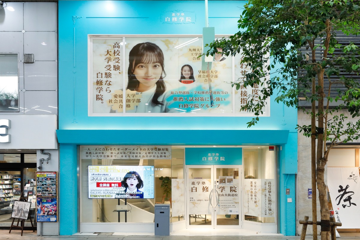 今回は、大街道にオープンした「進学塾 白修学院 ブロードバンド予備校 松山大街道校」へ。姉妹校の新居浜校では、数々の国公立大学・難関私立大学の合格実績を誇る、信頼と安心感のある学習塾です。