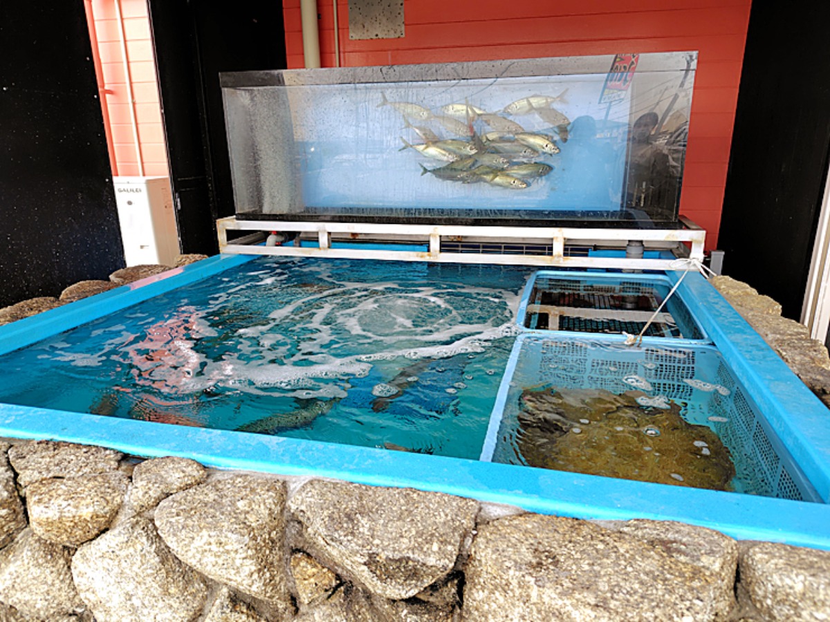 入口には生け簀が。サバやヒラメが泳いでいました。