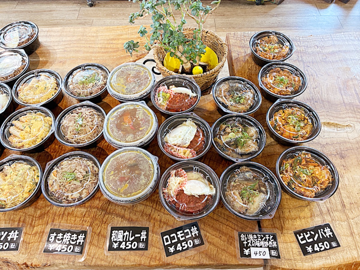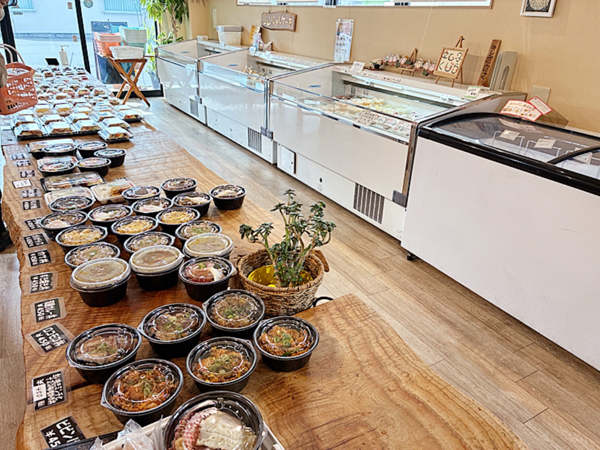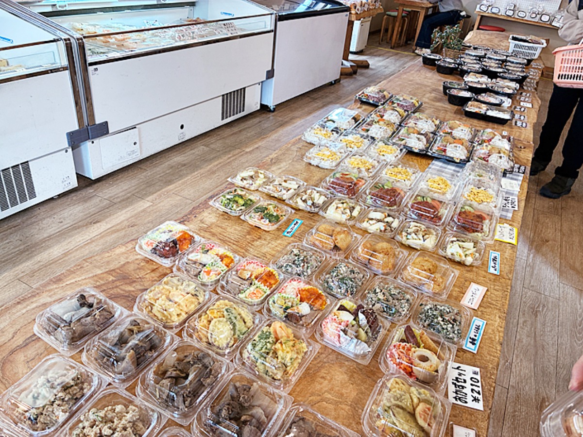 店内には大きな木のテーブルがあり、ズラッとたくさんのお弁当やおかずが並んでいました。