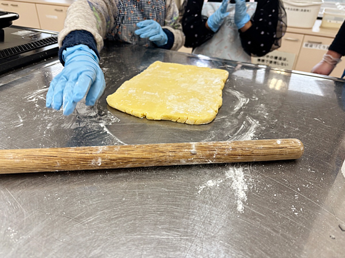 「どれくらいまで伸ばしたらいいですか~?」「生地が割れた~」「生地がくっつく~」とさまざまな声が聞こえてきます。