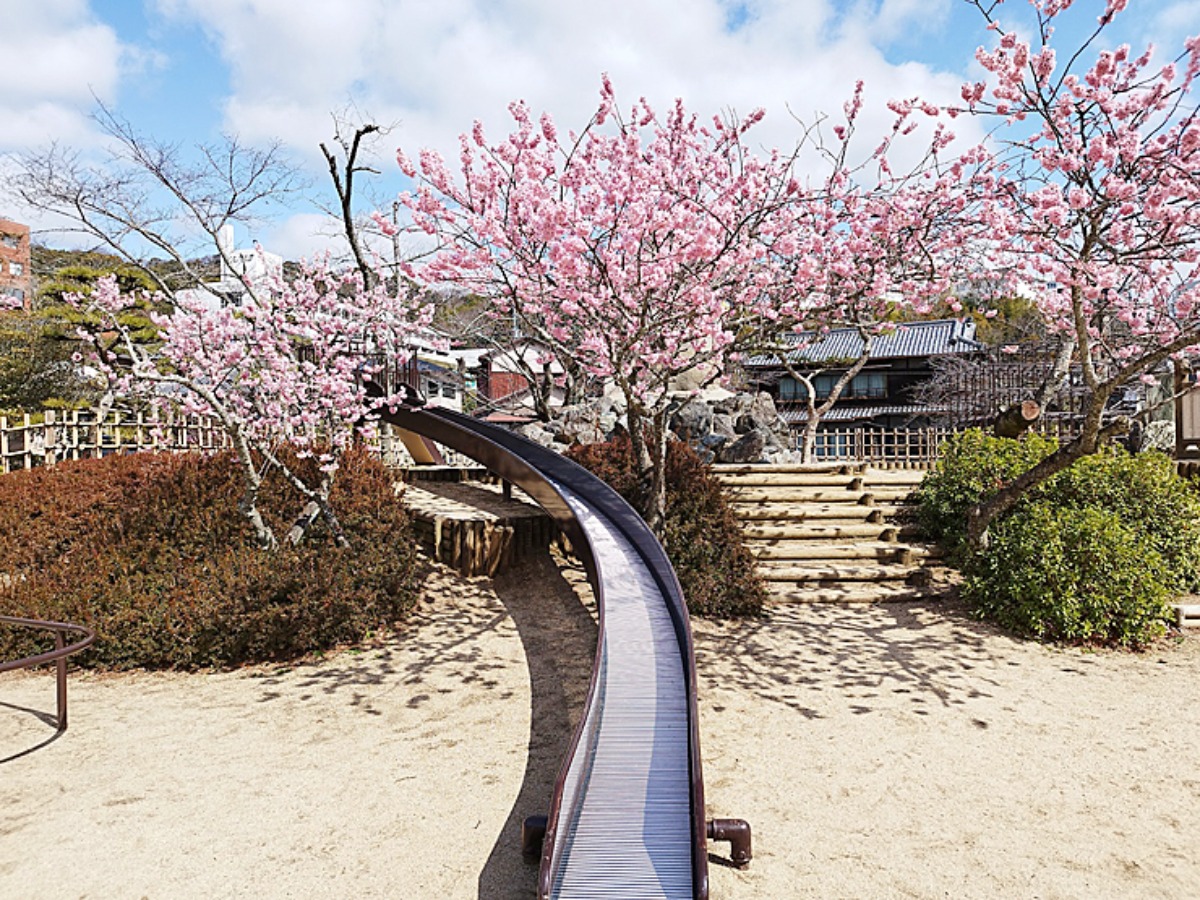 道後公園にも、すべり台やシーソー、ブランコなどの遊具がしっかり揃っているのがうれしいところ。中でも大型のすべり台は迫力十分で、大人でも童心に帰って楽しめそうです。