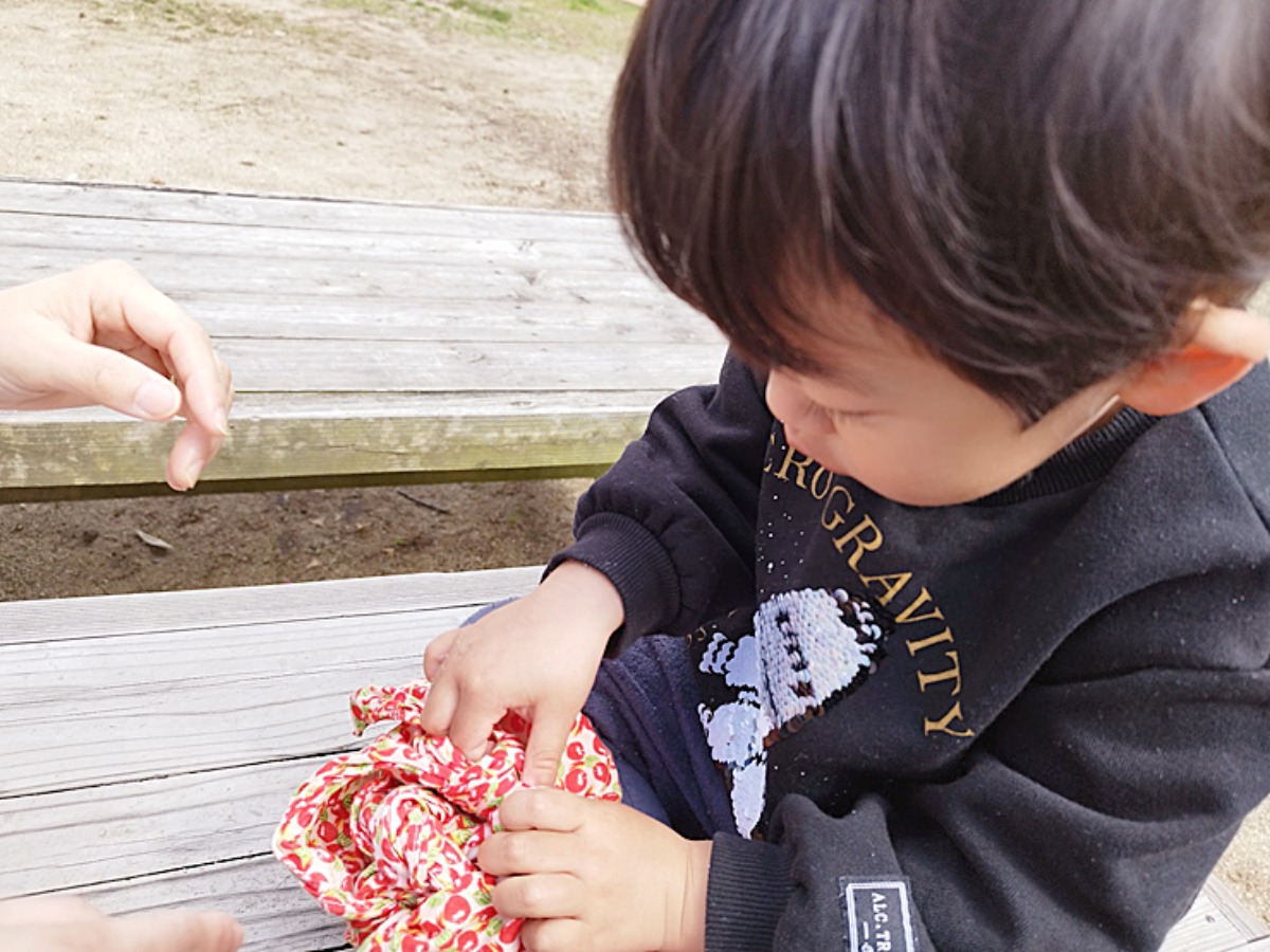 ベンチに腰掛け、お弁当の風呂敷を開けようと奮闘する息子氏。