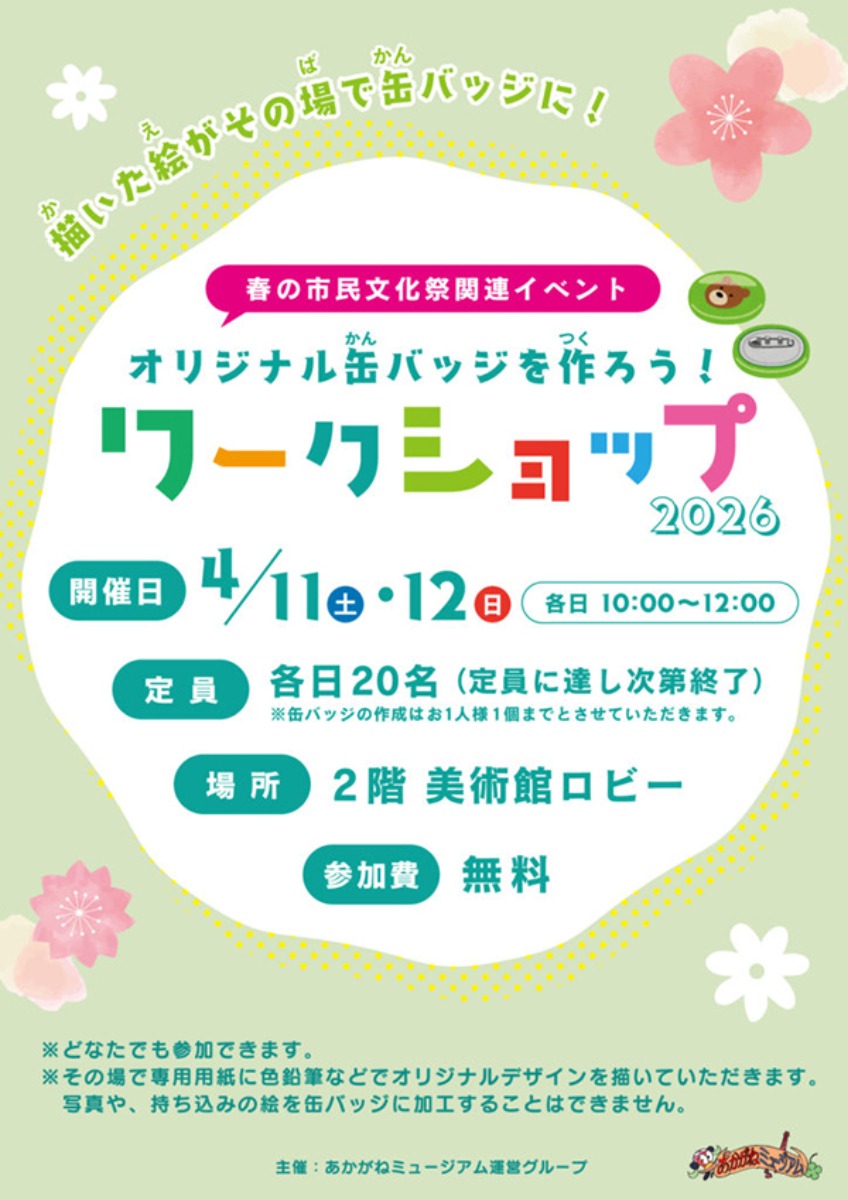 また、4月11日(土)・12日(日)には「あかがねミュージアム2階ロビー」で「オリジナル缶バッジをつくろう!」ワークショップも開催!