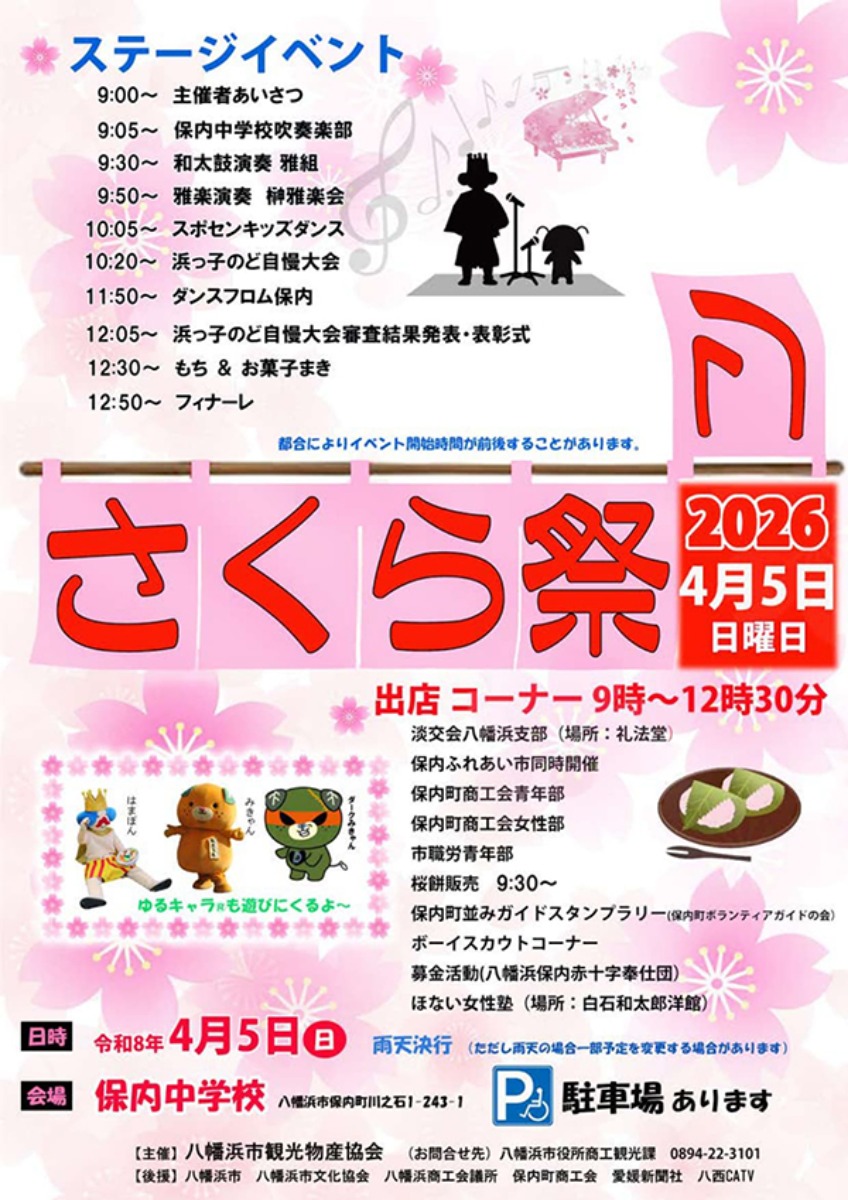 愛媛県八幡浜市で毎年大注目のイベント「さくら祭り」が、2026年4月5日(日)に八幡浜市立保内中学校で開催されます。