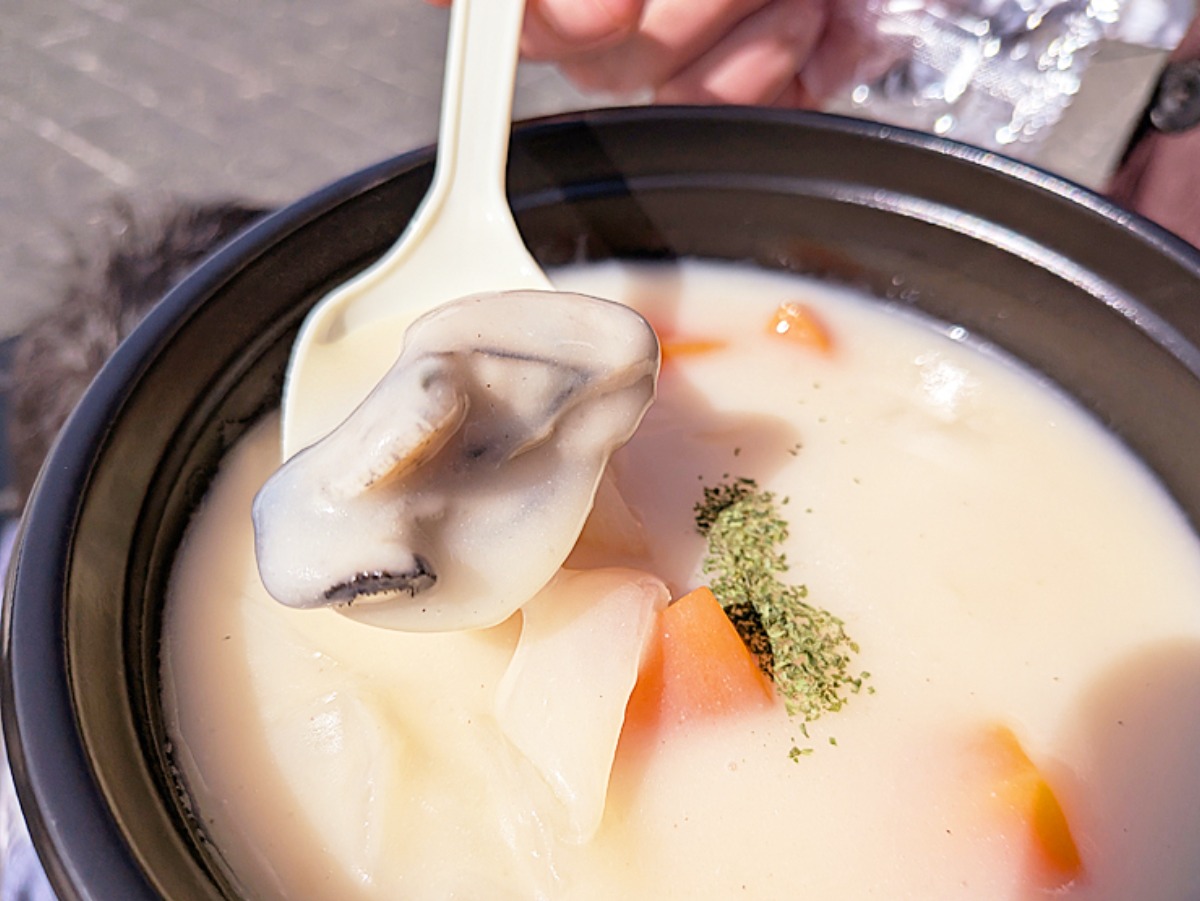 その中で気になったのが、大きな鍋のようなもので作られていた蒸し牡蠣。さっそく購入し、友人たちと合流して、いざ実食。