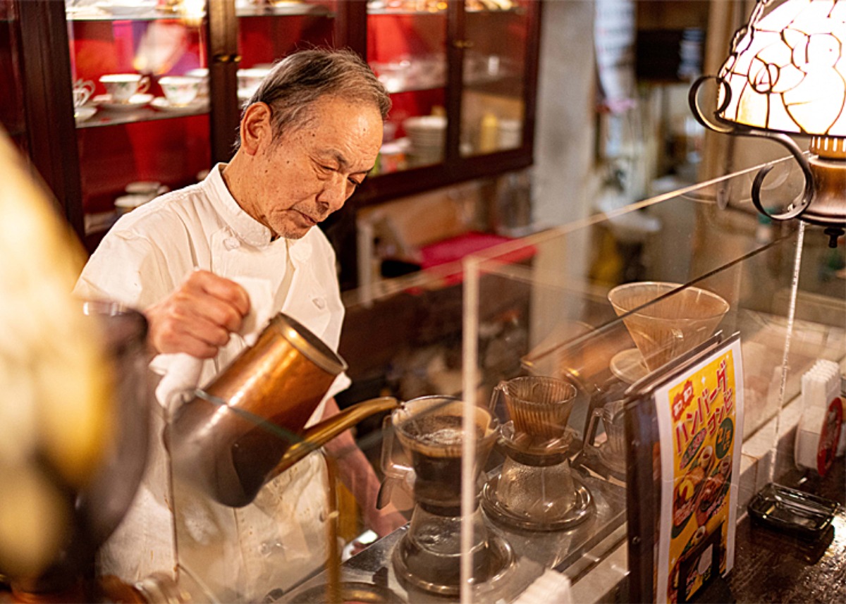 兄の味を受け継ぎながら改良を重ね、現在の「アムール」の味を築いた。調理もコーヒーのドリップも丁寧にこなす多才な店主。
