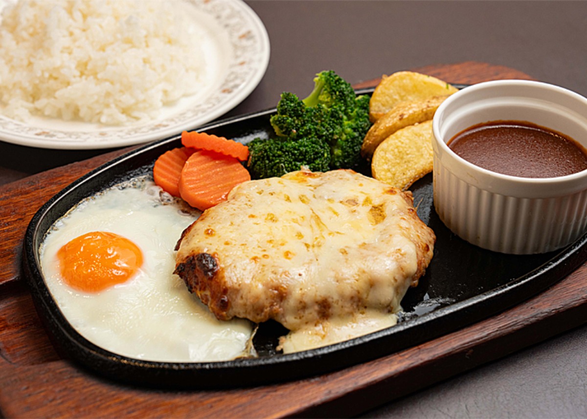 とろけるチーズと特製デミグラスソースが相性抜群の王道ハンバーグ。200gのボリューム感も◎。目玉焼きと絡めながら召し上がれ