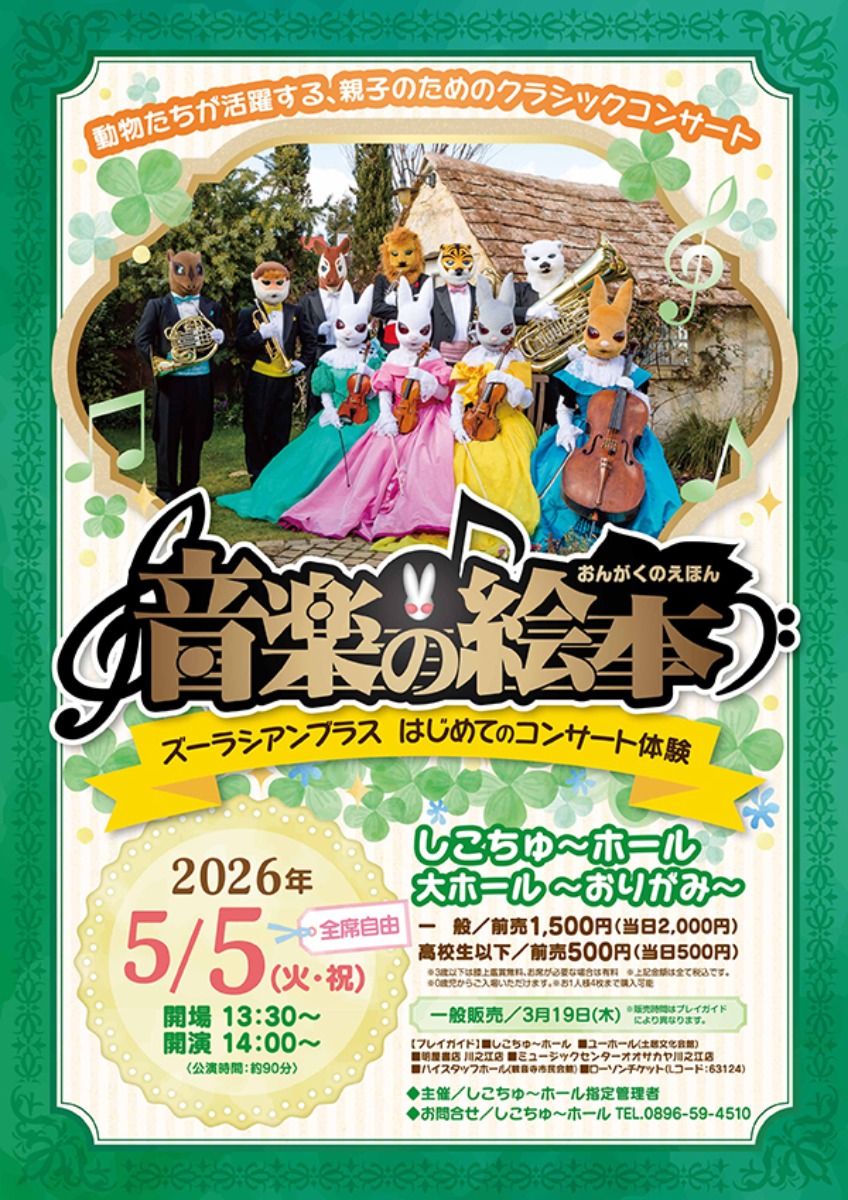 四国中央市のしこちゅ~ホール 大ホール ~おりがみ~で2026年5月5日(火・祝)、「音楽の絵本 ズーラシアンブラス初めてのコンサート体験」が開催されます♪