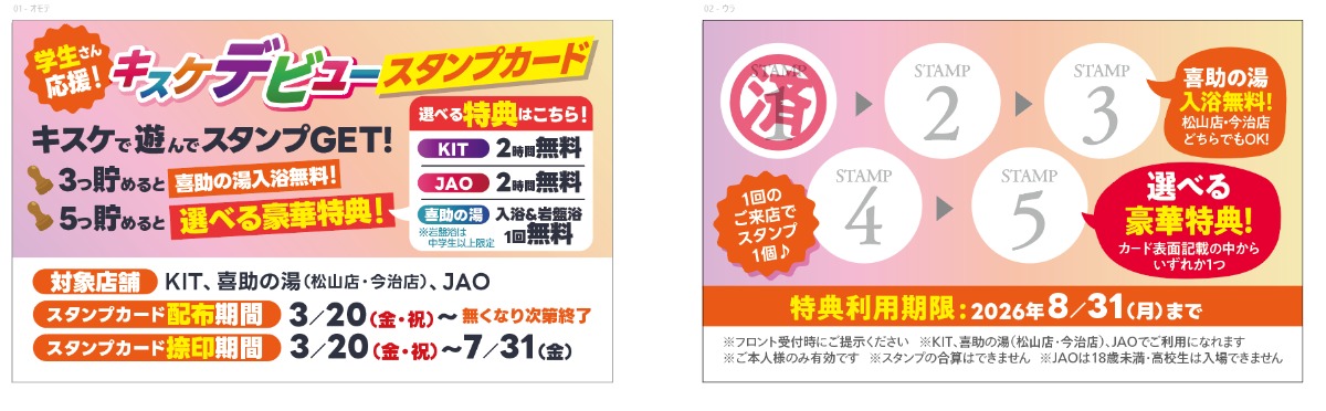 さらにスタンプ5個を集めると、KIT2時間無料、喜助の湯の入浴&岩盤浴1回無料、JAO2時間無料の中から好きな特典を選べます。