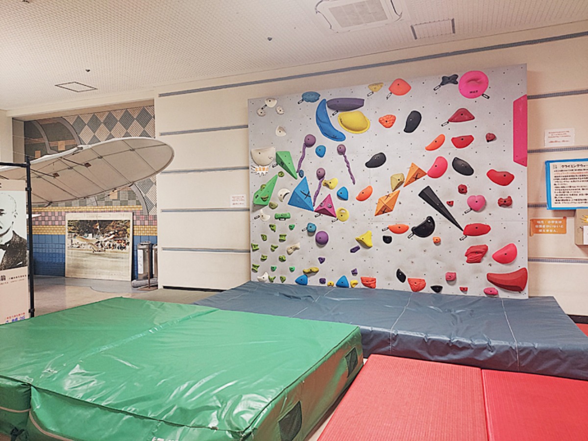 スポーツセンターには、入り口を入ってすぐのホールに大きなボルダリングが設置されており、運動のスイッチが入ります。
