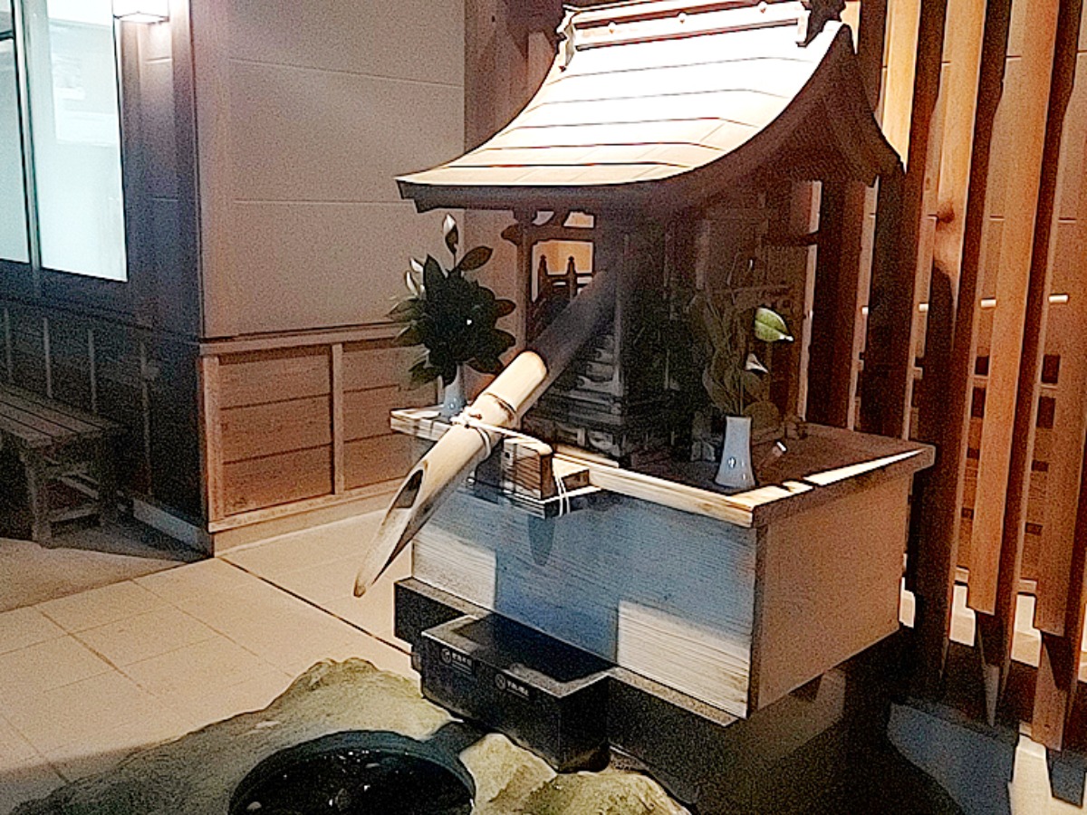 玄関の横には、小さな神社のような雰囲気をまとったししおどし風のオブジェがありました。こうした細やかな演出に、思わずテンションが上がります。