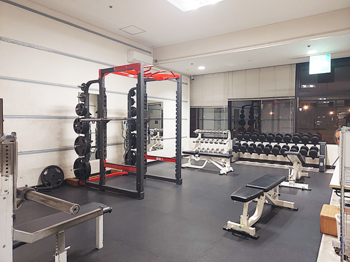 横のスポーツセンターには、入口すぐの場所にボルダリングがあり、さらにはトレッドミルやバイクなどもそろっています。筋トレから有酸素運動まで、本格的に体を動かせる環境が整っています。
