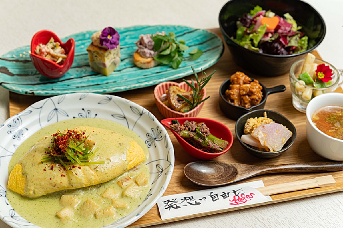 「昼ディナープレート」(1,800円)。今日のオムライス、おかず8品、サラダ、スープが付いた豪華版