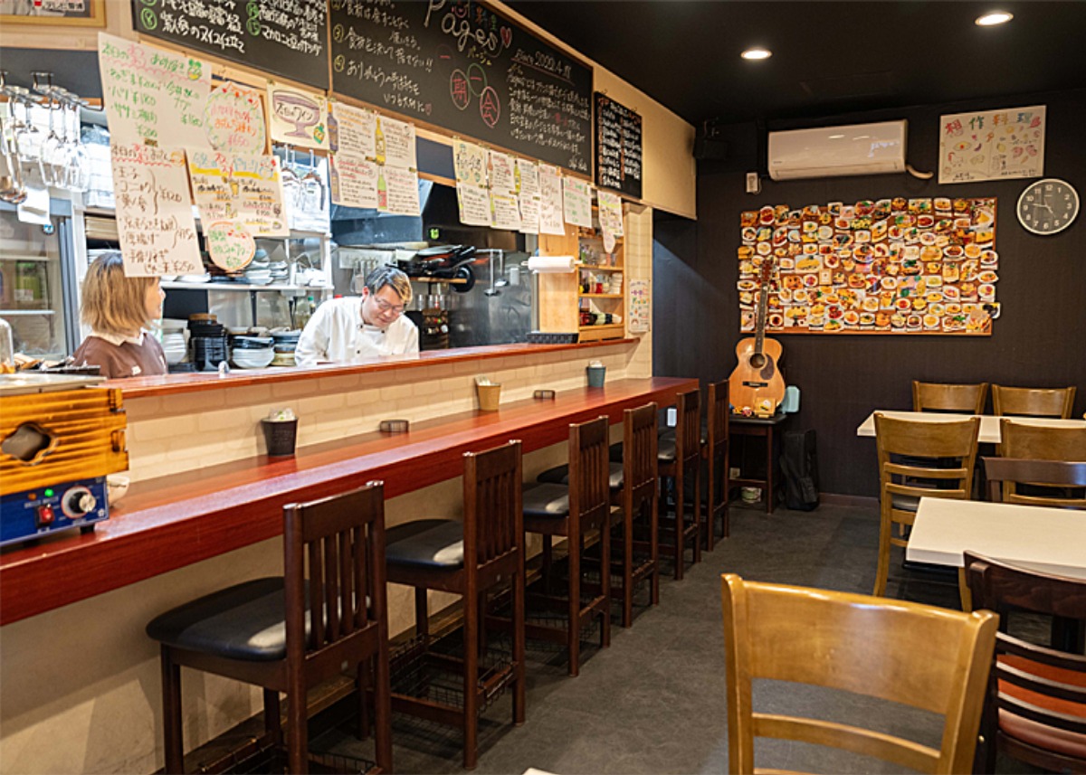 シェフと奥さんによる手書きメニューやポップが彩りを添える店内。夜は食と会話が弾む洋風居酒屋に