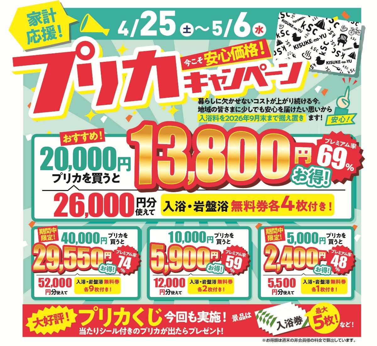 期間中は、プリペイドカードの購入額に応じてチャージ額が増えるほか、入浴無料券や岩盤浴無料券もプレゼントされます。さらに、当たりシール付きのプリカが当たる「プリカくじ」も実施されます。