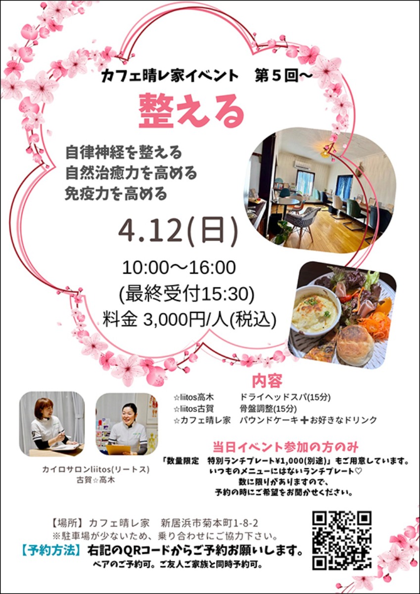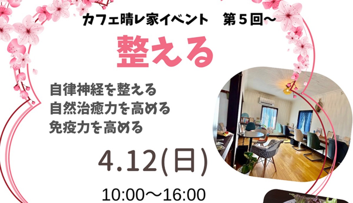 新居浜市の「Cafe晴レ家」では、2026年4月12日(日)に「心と体をリセット!『整える』イベント」を開催♪