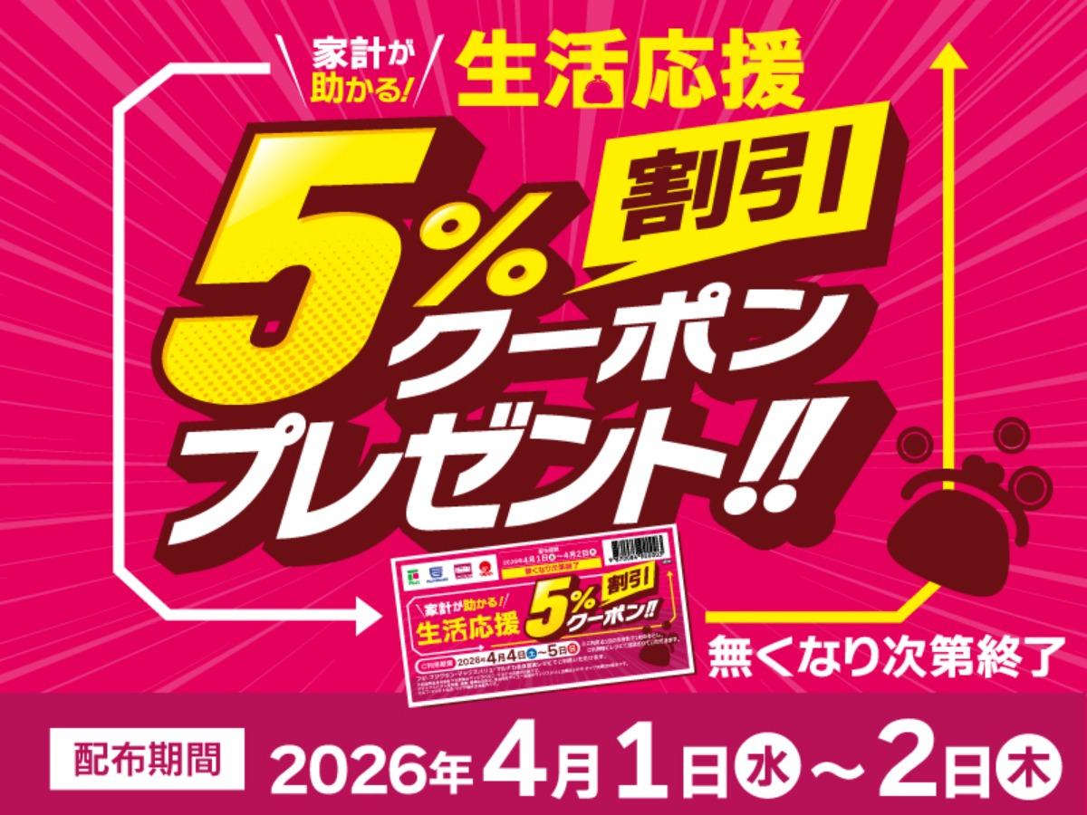 【フジ】4月1日(水)~4月2日(木) 生活応援5%割引クーポンプレゼント!\家計が助かる!/