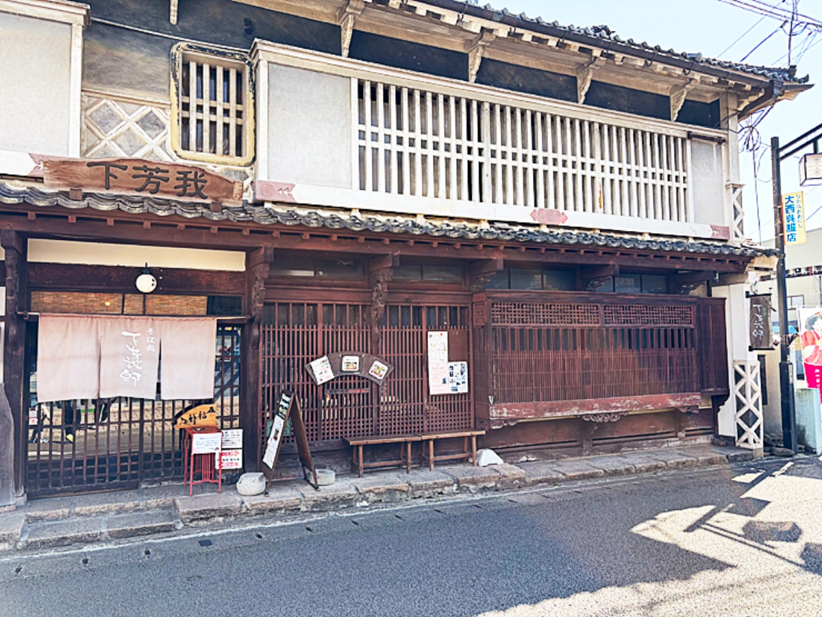 内子駅からゆっくり歩いて10分、通りのなかでひときわ目を引くのが「蕎麦 つみ草料理 下芳我邸」です。