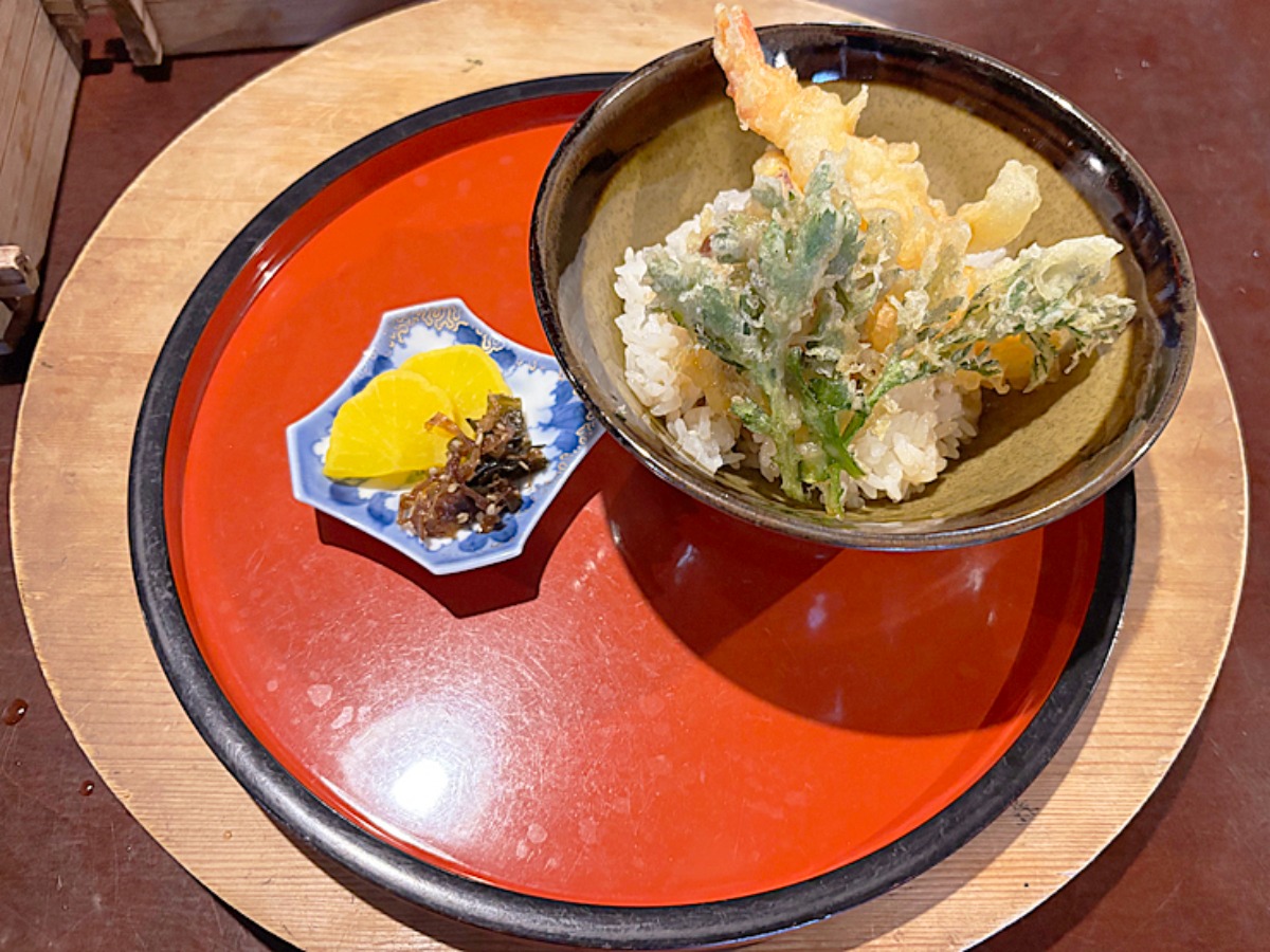 天丼は揚げたての天ぷらがたっぷりのり、ボリュームも十分で食べ応えがあります。見た目も味も満足できる内容で、しっかりお腹も満たされました。