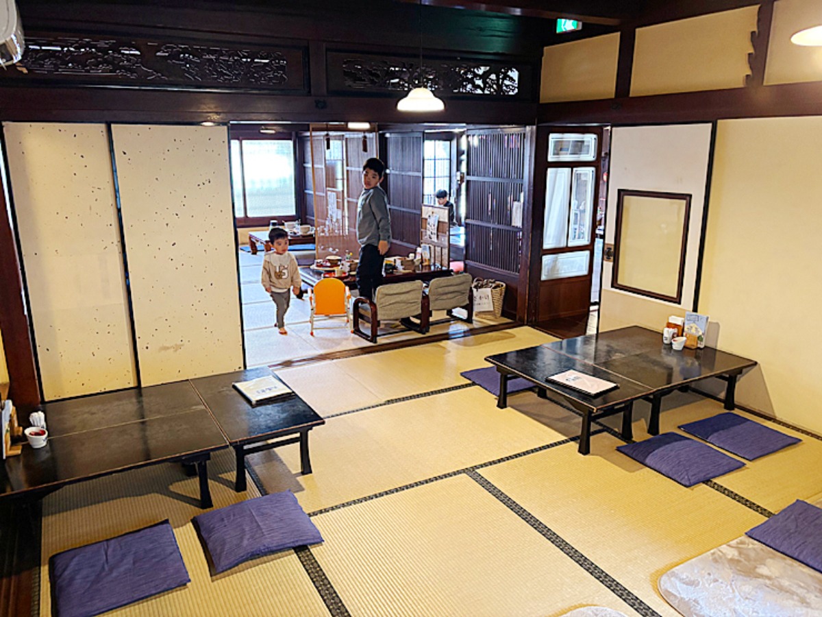 店内は木の温もりを感じる落ち着いた空間で、広々とした座敷席があります。テーブル同士の間隔にもゆとりがあり、子ども連れでも安心して過ごせる雰囲気です。