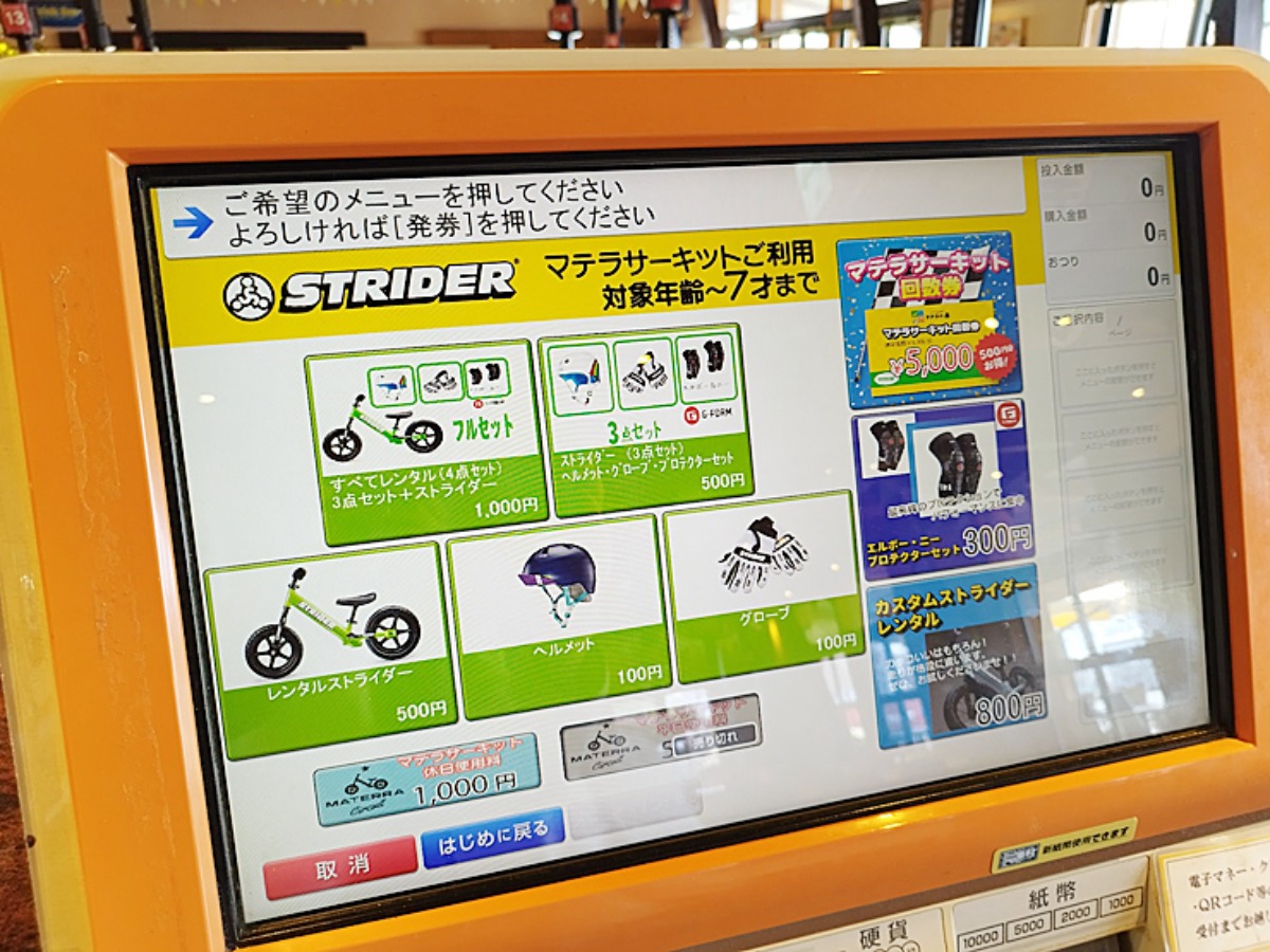 以前からコースの存在は知っていたので、ぜひとも息子氏にはストライダーにハマって貰えたら嬉しいなと思いつつ、店内にある券売機でマテラサーキットの使用券をさっそく購入。