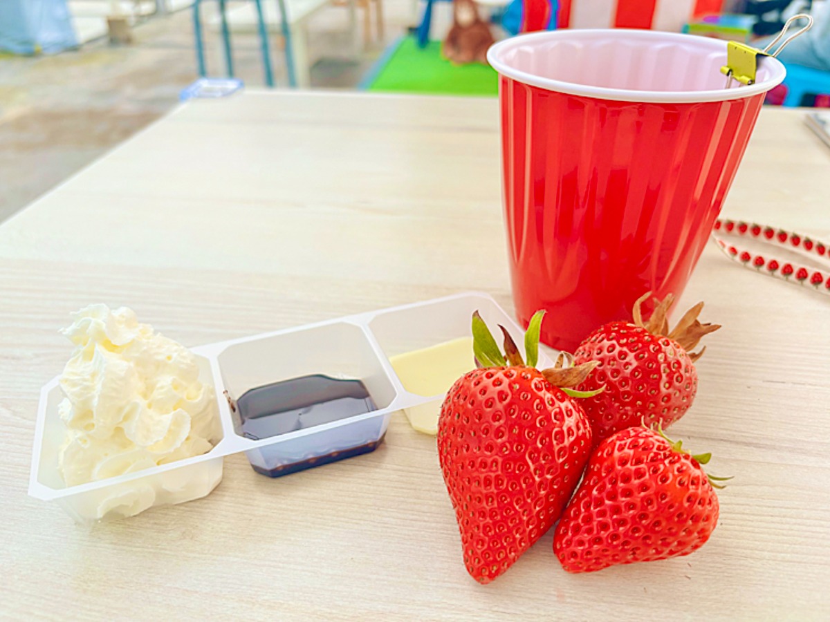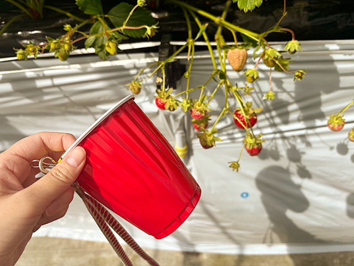 これを持ったまま片手でいちごを狩るのは至難の業なので、テーブルに置いてからいちごを取りに行くことをお勧めします。