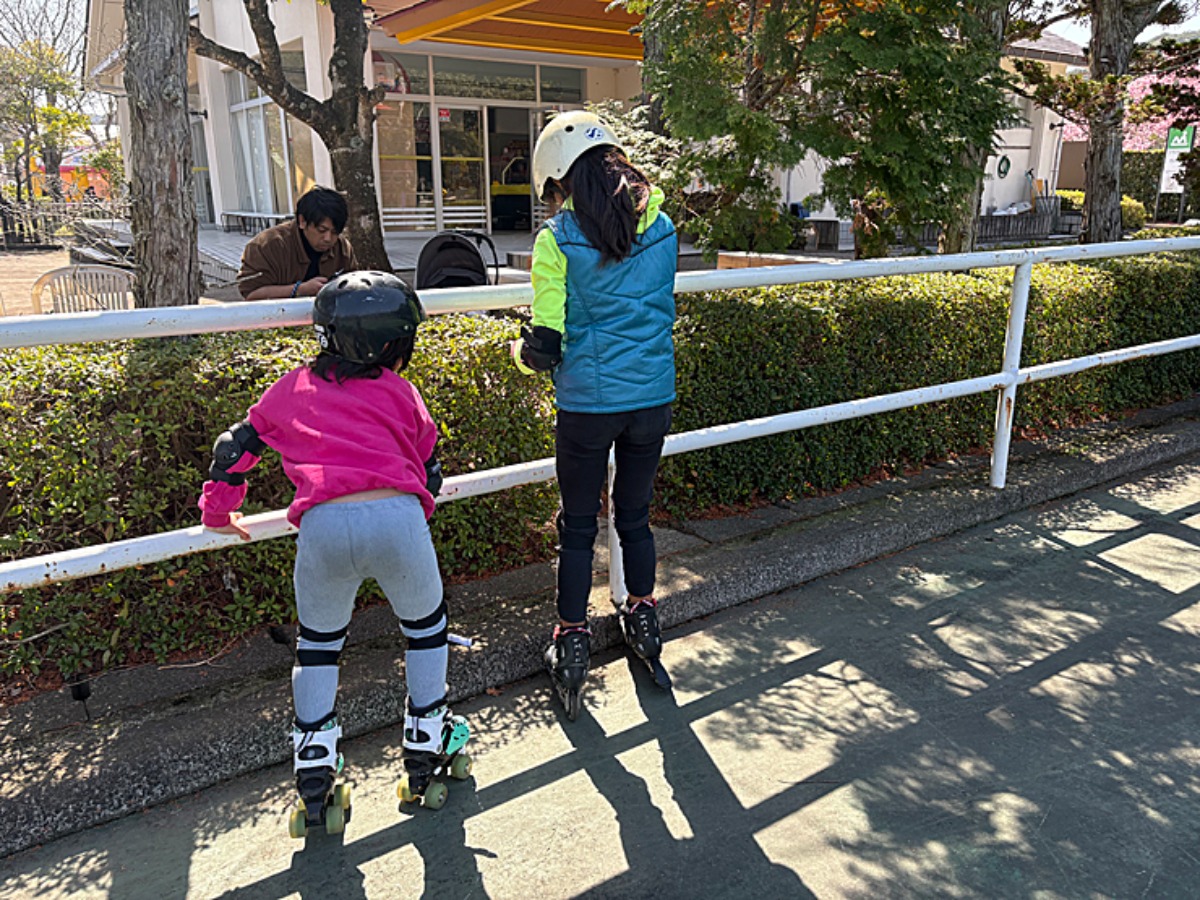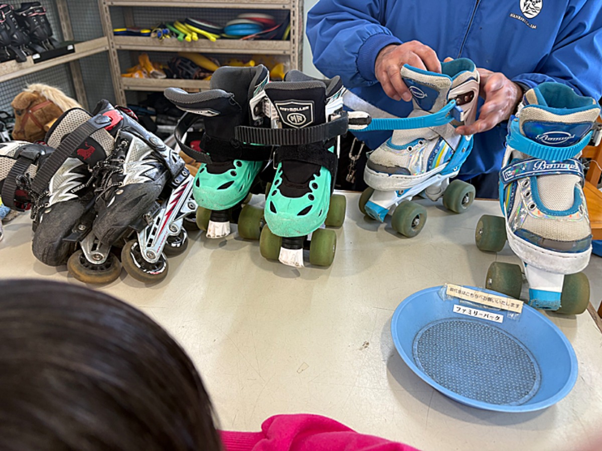 まずは、靴のサイズを伝えると肘当て、膝当て、ヘルメットを一緒にもらいます。代金は先払い。大人と小人も300円程でした。17時閉店までが返却期限で、時間もたっぷり遊べます。