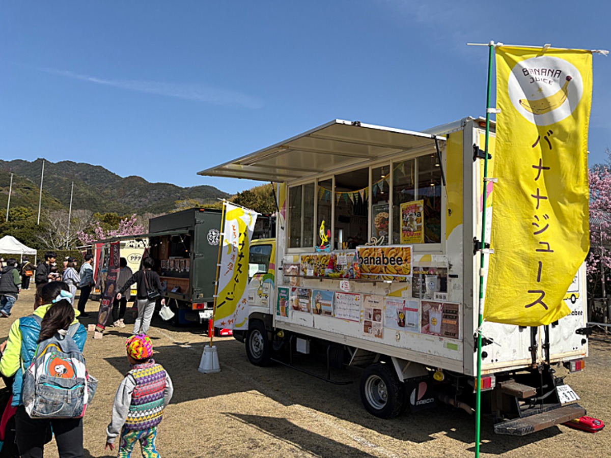 キッチンカーは、バナナジュースや肉丼、唐揚げやポテト、ピザなどが出ており、どれも美味しそうで迷います。