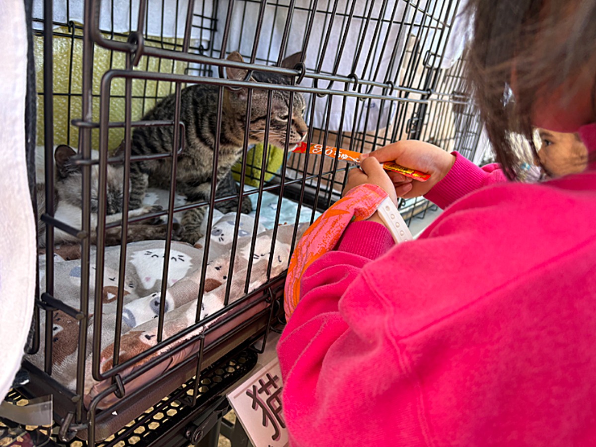 今、家で1匹の猫ちゃんを飼っていますが、もう1匹いたらいいねーという話になり、どんな子たちがいるのかなーと見にきました。猫って本当に癒しで、手間もかからず、可愛いから大好きなんです。また、イベントを教えてくれた、知り合いの方も猫ちゃん達を連れて行くよーとの事で会いに来ました。