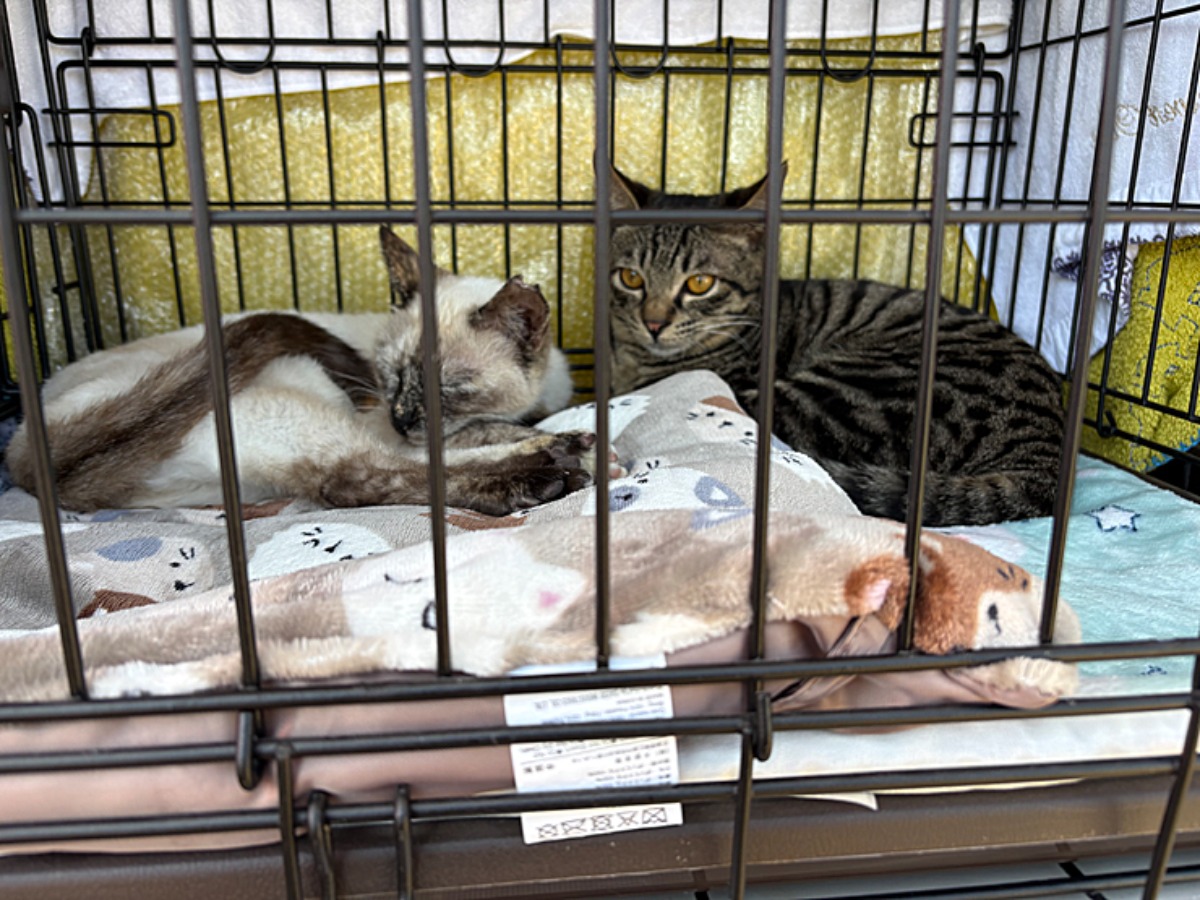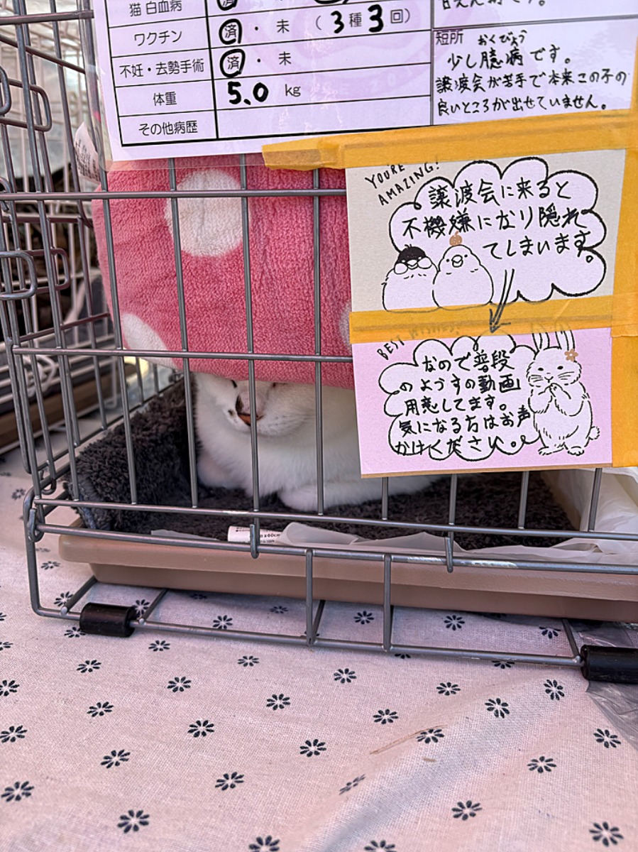 愛媛県の色々な地域で様々な保護猫活動している方がいるみたいで、沢山の猫ちゃんとわんちゃん達が来ていました。みんなゲージには入っていますが、怯えている子や、ご機嫌な子、それぞれ個性がありそれも楽しめます。