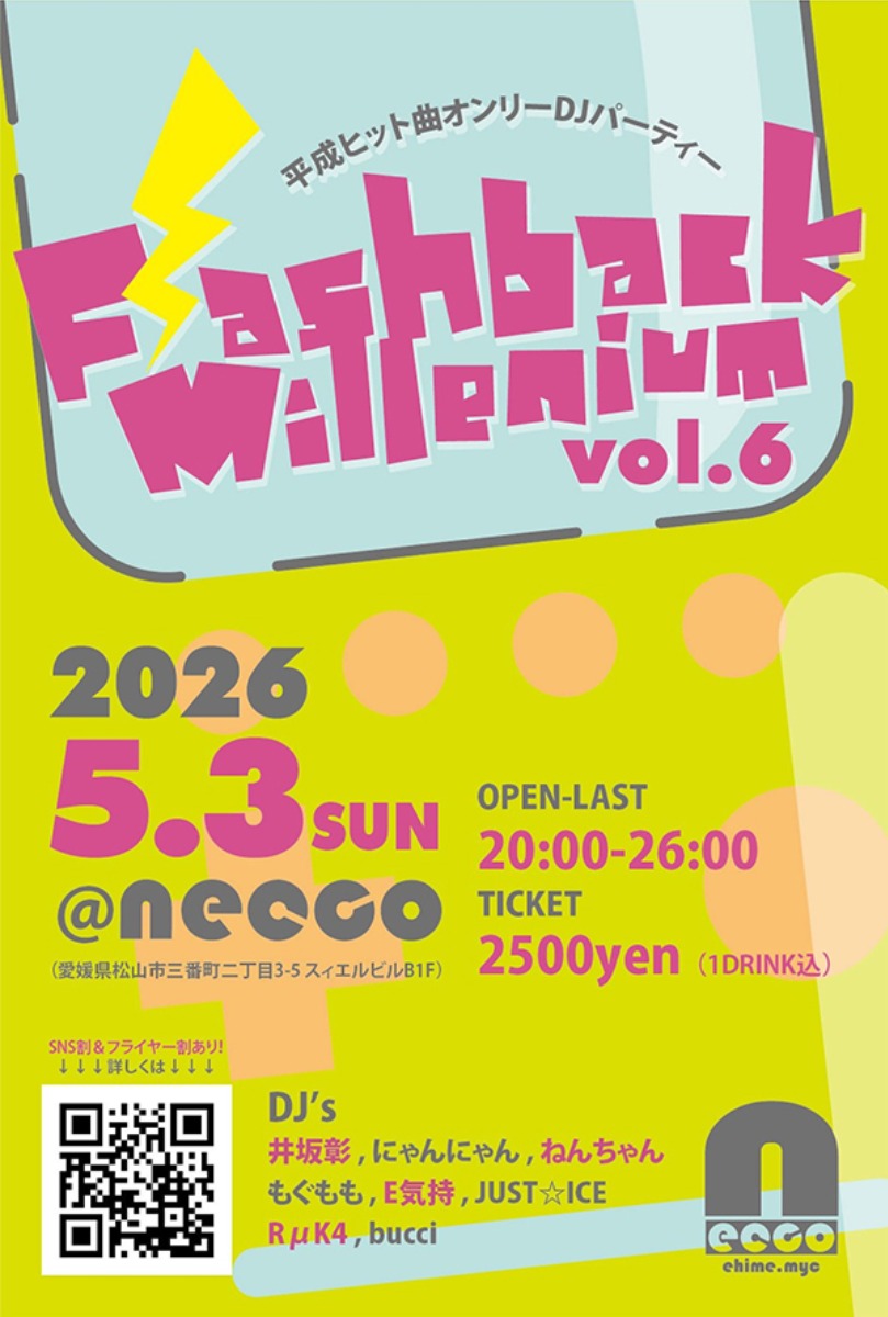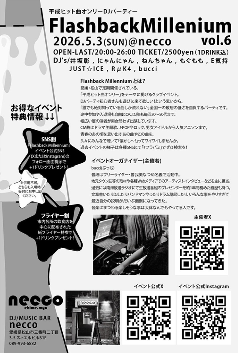 愛媛県松山市の中心街、大街道からもすぐのBar neccoで開催される「Flashback Millennium vol.6」は、平成の頃にヒットした曲だけを楽しめるDJイベント!