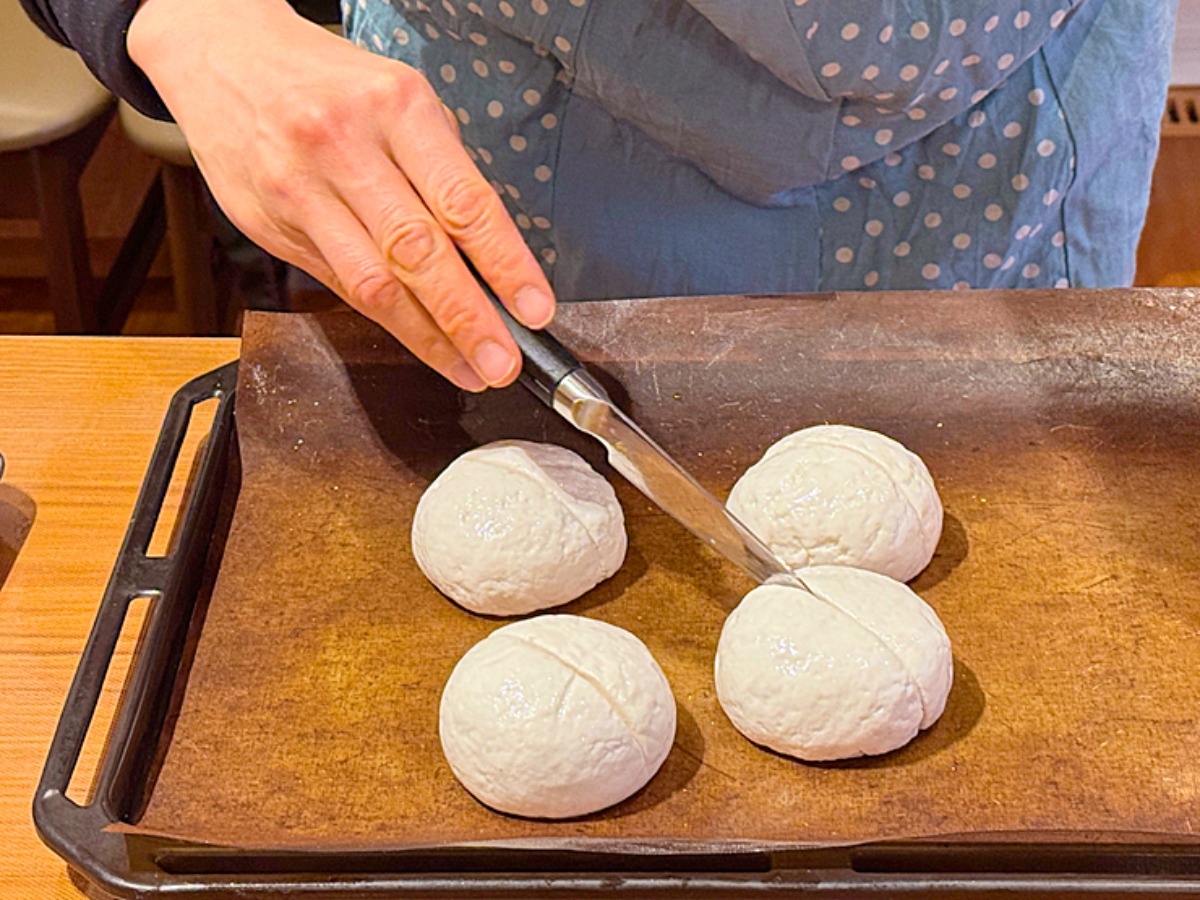 仕上げにナイフでクープを入れ、表面にこめ油を塗って乾燥を防ぎ、予熱したオーブンで焼き上げます。