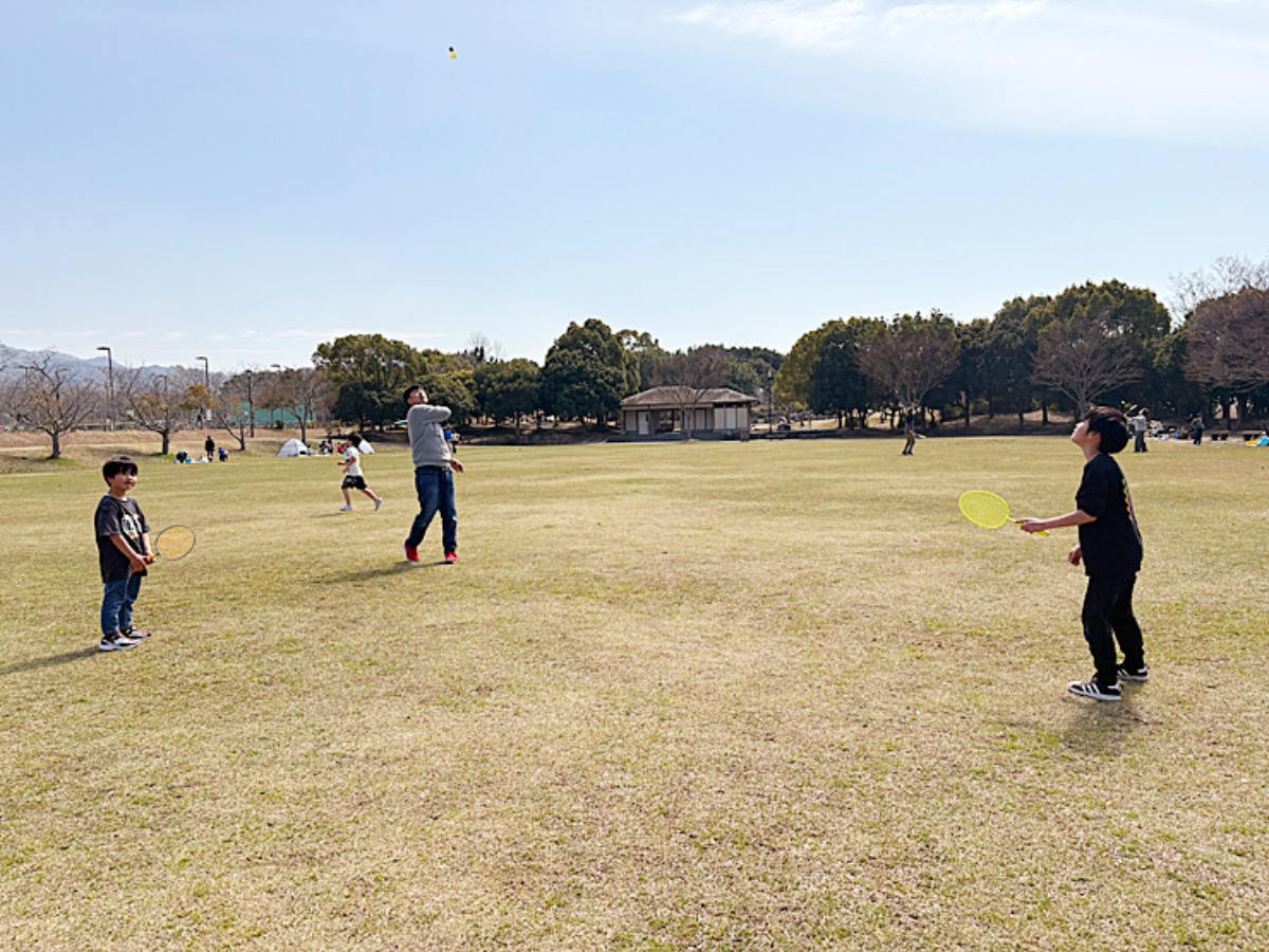 ご飯を食べ終えたあとは、待ちに待った遊びタイム。パパ&長男はバドミントンで10回ラリーに挑戦。