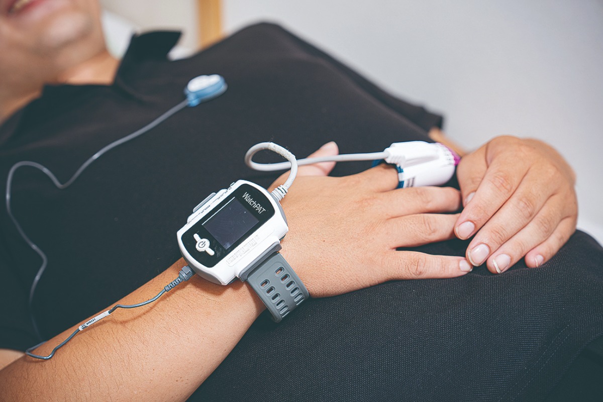 検査は専用機器を自宅で装着して寝るだけ。睡眠中の脈拍や血中酸素濃度、無呼吸の回数を記録し、症状の重さを測る。重症と判定されればCPAP療法へ。基準に満たない時は、精密検査も考える。