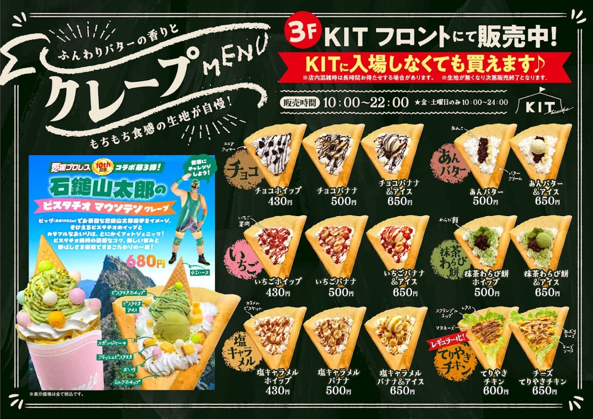 JR松山駅前のキスケKITで、愛媛プロレス10周年を記念したコラボ企画第3弾として、新作クレープ「石鎚山太郎のピスタチオマウンテンクレープ」が2026年4月1日から販売されます。