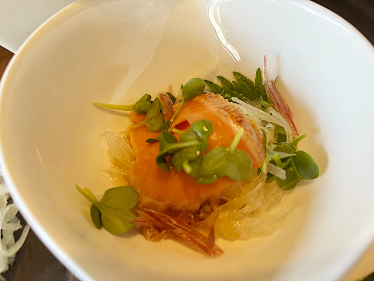 玉ねぎスライスの上にスモークサーモンが乗っており、贅沢感のある小鉢でした。