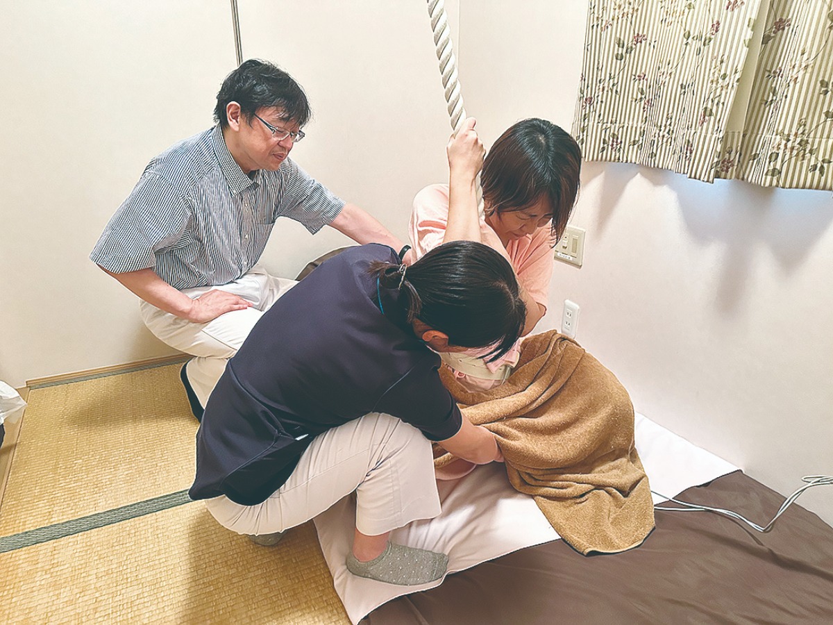 ▲「フリースタイル分娩」の様子。和室で産み綱を握っての出産も可能