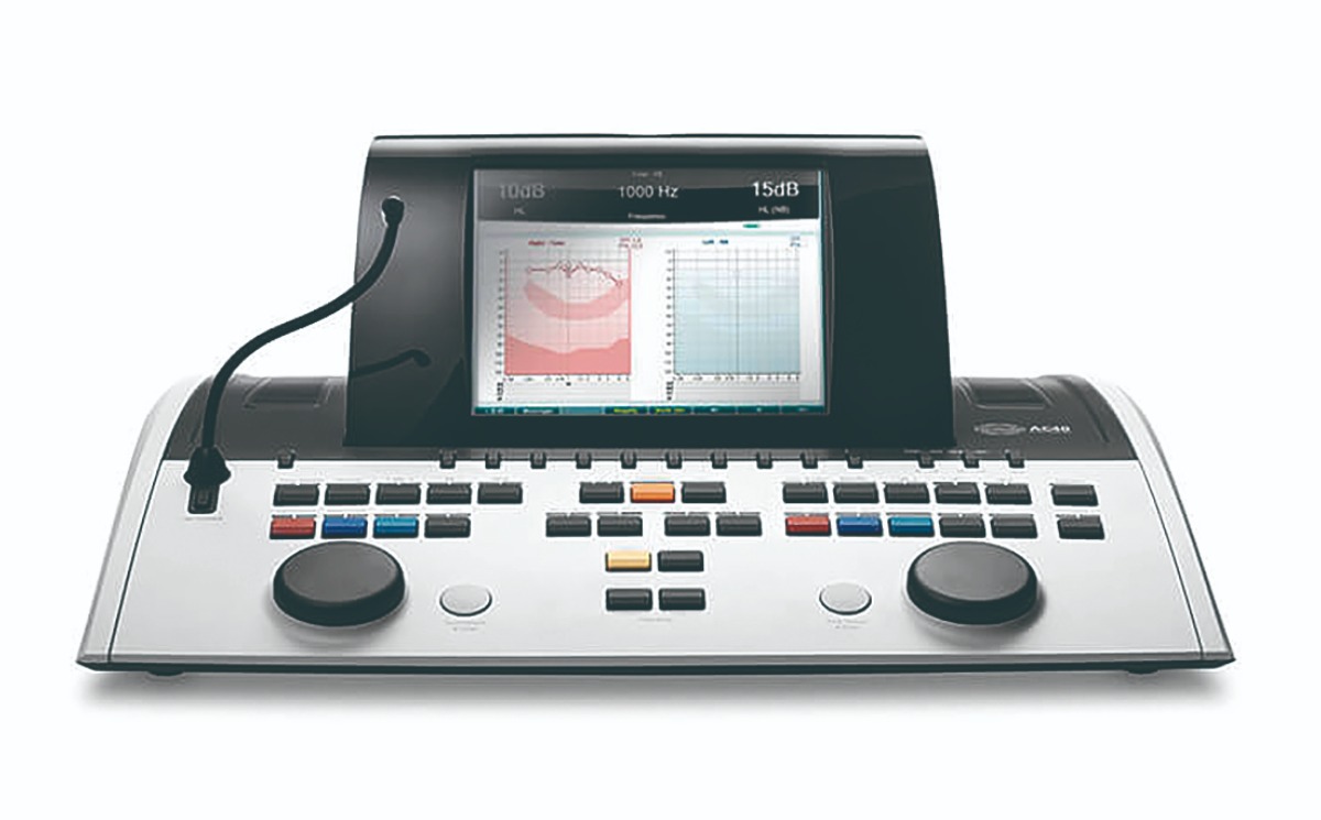 ▲20kHzまでの高周波数領域の測定ができる機器。難聴の早期発見に有用