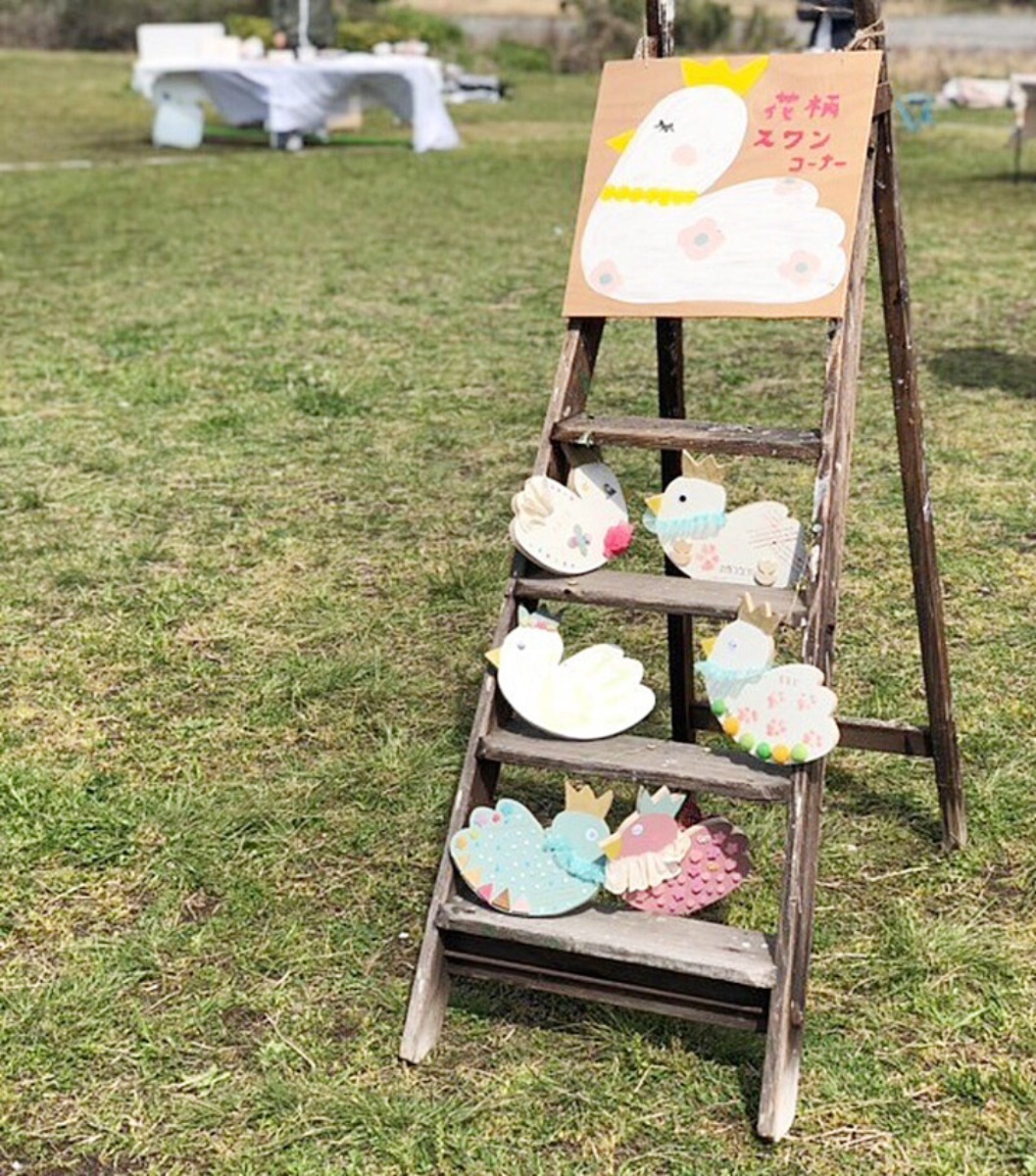 フォトスポットとしても人気の木の家ブースや、スワン型黒板にチョークでお絵かきできるコーナーも用意。