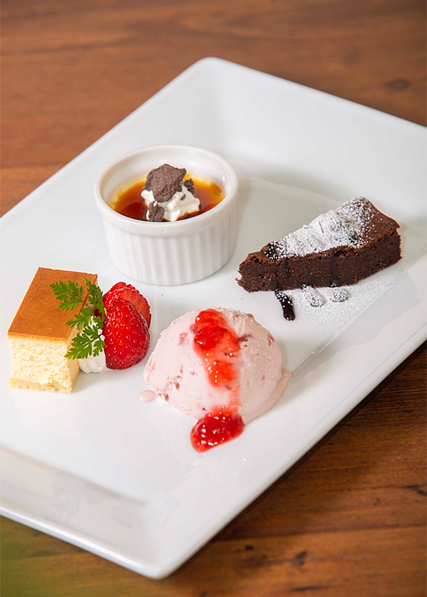 この日は、イチゴを添えた「NYチーズケーキ」、小麦粉不使用のチョコケーキ「カプリ風トルタ」、滑らかな舌触りの「カスタードプリン」、「本日のアイス」の4種。