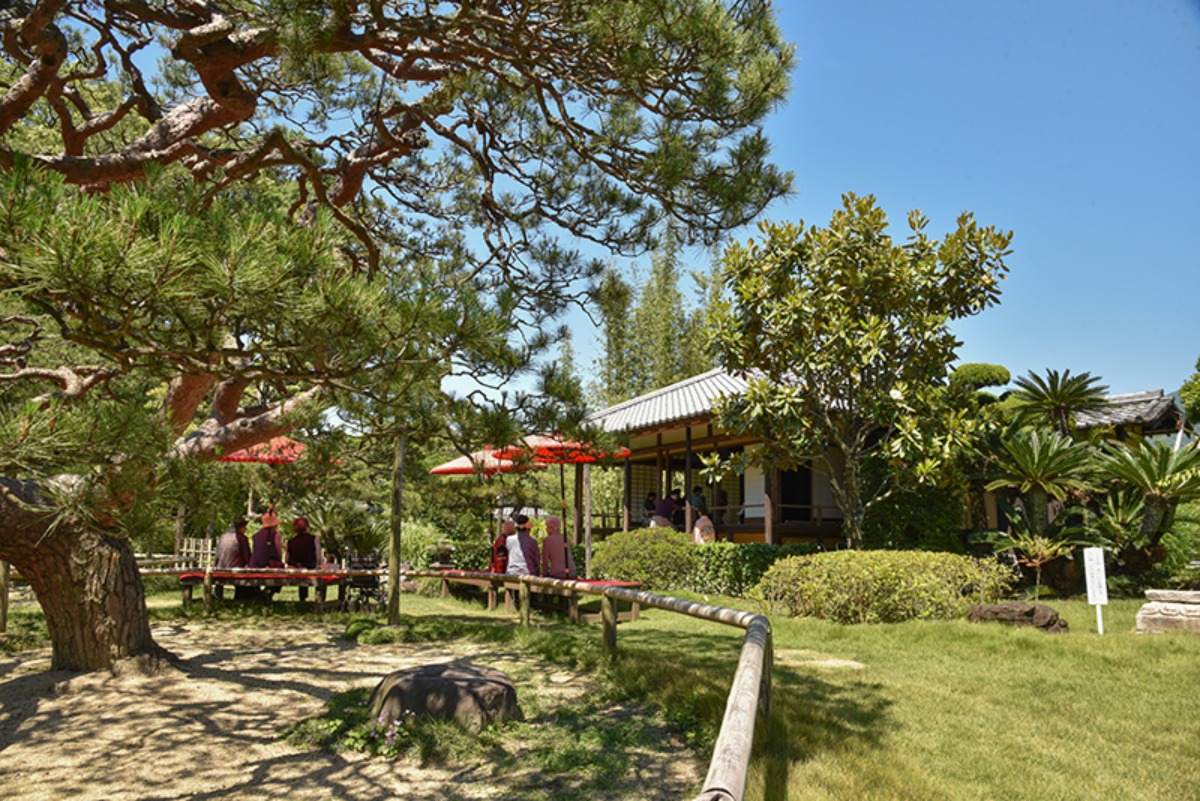 お茶室から眺める藤棚や、春の陽光が差し込む庭園を背景に味わう一服は格別の美味しさです。
