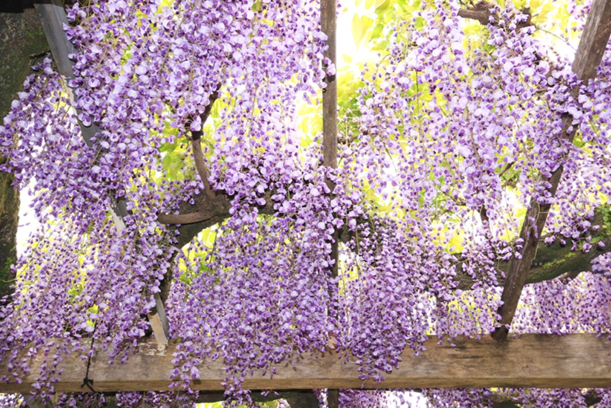 歴史の息吹を感じる庭園に、鮮やかな藤の花で彩られるこの時期だけの絶景が広がります。
