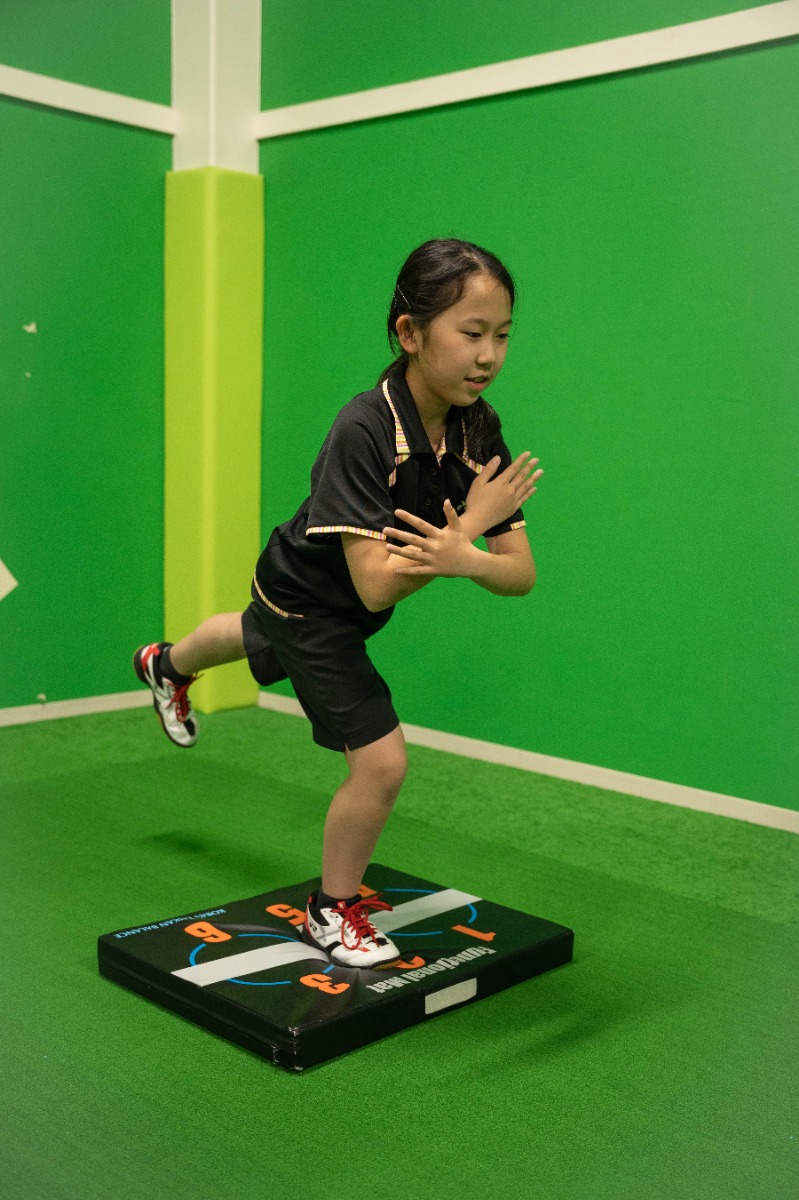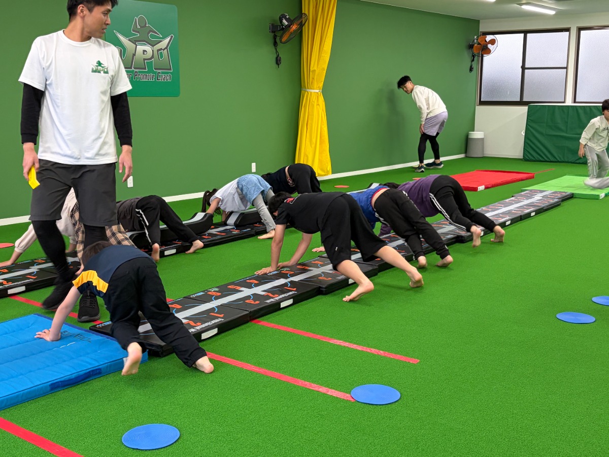 マット運動や、ハードルを使ったアジリティトレーニングなども取り入れ、バランス感覚や反応力、コーディネーション能力も養成。
