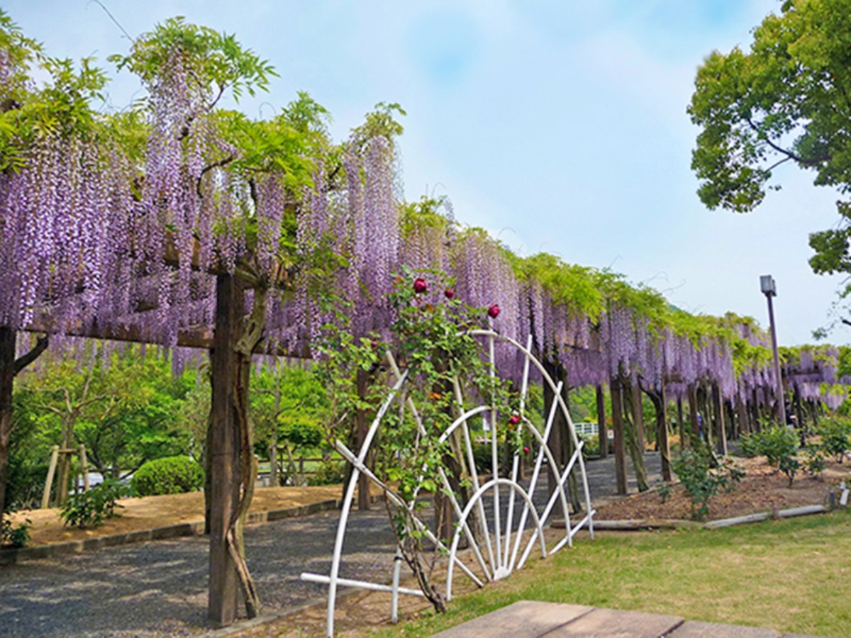 東側一帯に広がるこの藤棚では、4月下旬から5月上旬にかけて紫や白、ピンク色の藤が咲き誇ります。